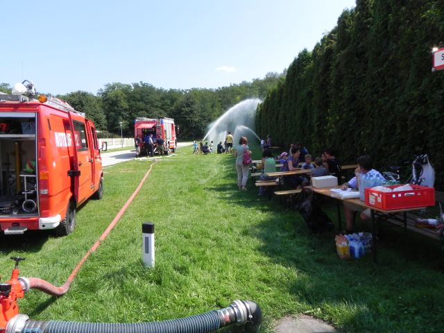 Schlussendlich wurde auch die Wurfweite unseres Wasserwerfers demonstriert, wovon alle Kinder begeistert waren. Bei den hohen Außentemperaturen war es kein Wunder, dass die meisten Kinder eine Abkühlung benötigten und mit nassen Kleidungsstücken nach Hause gingen, das "Ferienspiel" wurde wieder einmal zum "Wasserspiel". Danach gab es noch eine Rundfahrt mit unserem Kleinlöschfahrzeug.