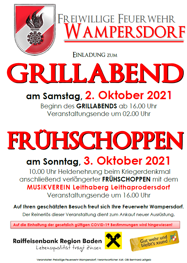 Die Freiwillige Feuerwerh Wampersdorf möchte Sie recht herzlich zum Grillabend am 02.10.2021 und zum verlängertem Frühschoppen am 03.10.2021 einladen.