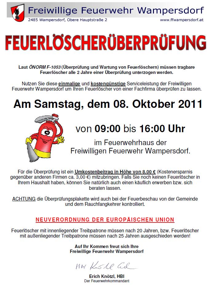 Am Samstag, dem 08.10.2011 findet in der Zeit von 09.00 bis 16.00 Uhr die gesetzlich vorgeschriebene Feuerlöscherüberprüfung im Feuerwehrhaus der FF Wampersdorf statt. Nutzen Sie diese einmalige und kostengünstige Serviceleistung der Freiwilligen Feuerwehr Wampersdorf um Ihren Feuerlöscher von einer Fachfirma überprüfen zu lassen.