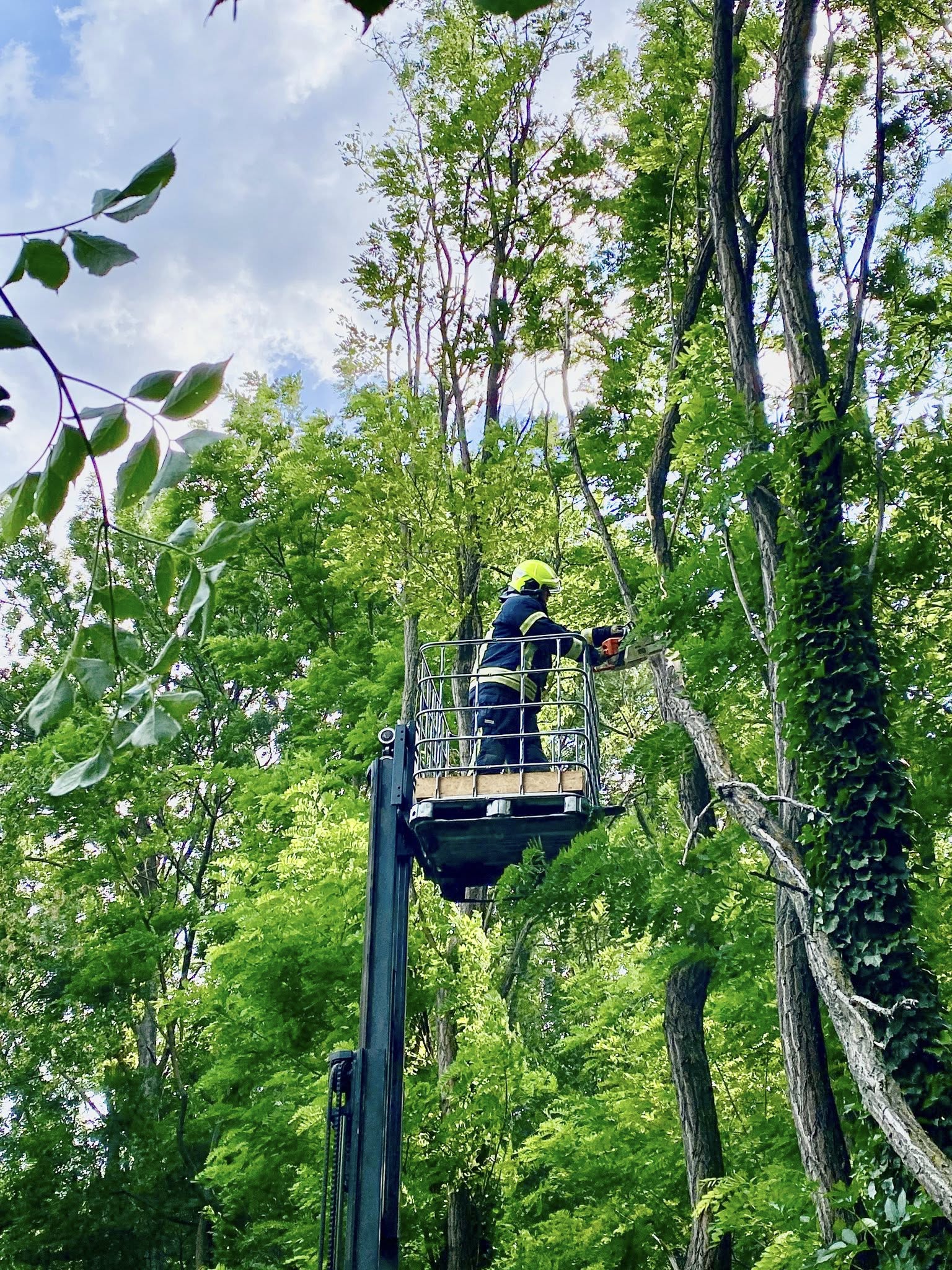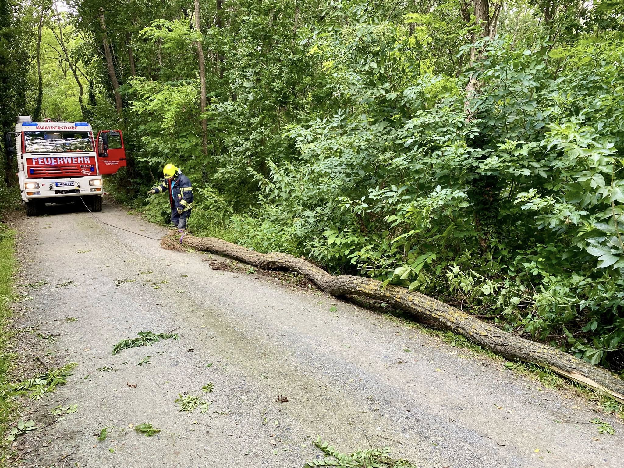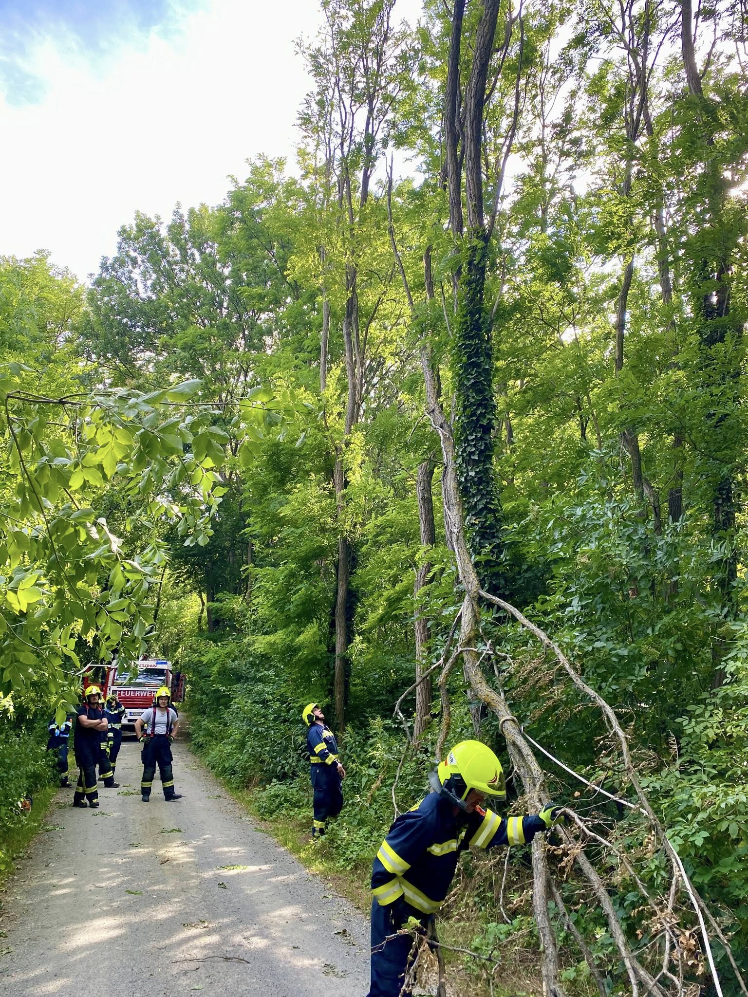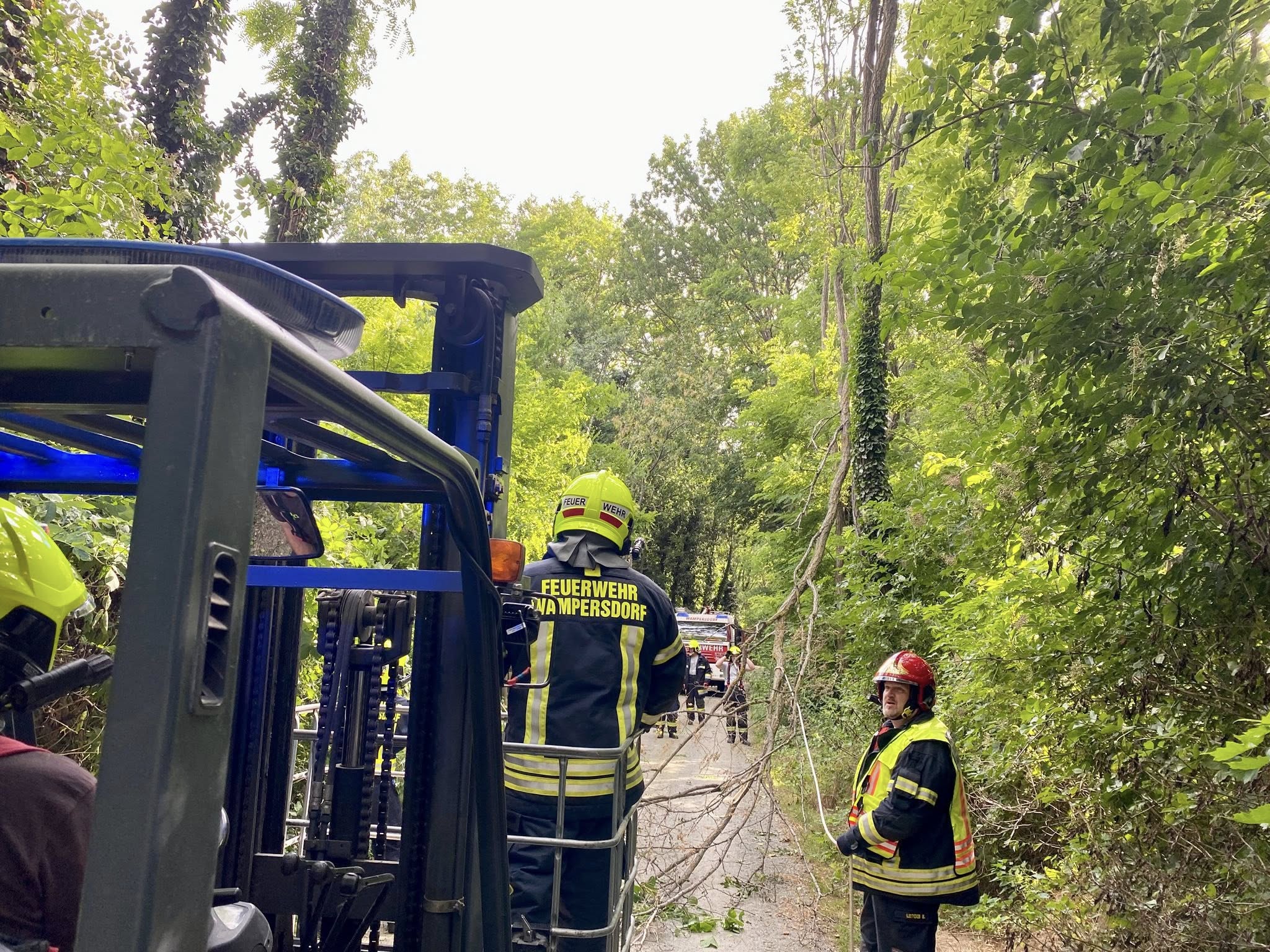 Nachdem die Einsatzstelle abgesichert war wurde der Ast mittels Motorsäge, Stapler und Seilwinde sicher entfernt. Da der Baum bereits stark geschädigt war, wurde auch dieser kontrolliert gefällt und vom Feldweg beseitigt.