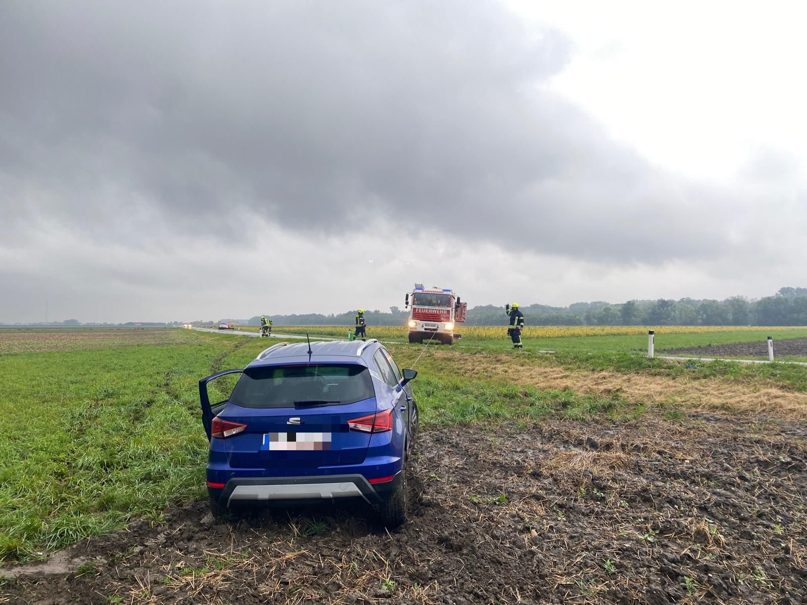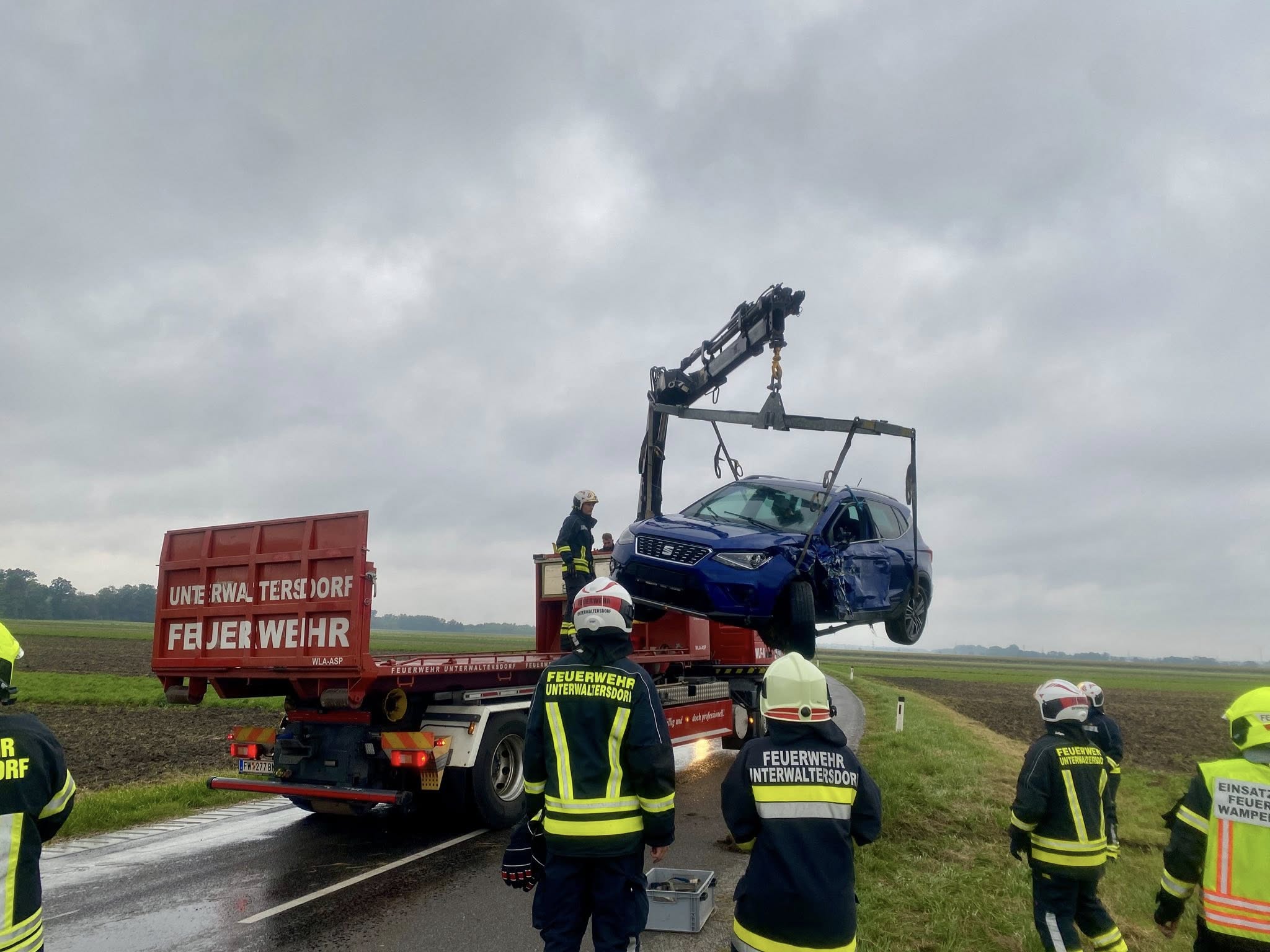 Nach Freigabe der Unfallstelle durch die Polizei wurde der in den Acker geschleuderte Unfallwagen mittels Seilwinde geborgen. Für den Abtransport wurde das Wechselladefahrzeug der Freiwillige Feuerwehr Unterwaltersdorf angefordert.