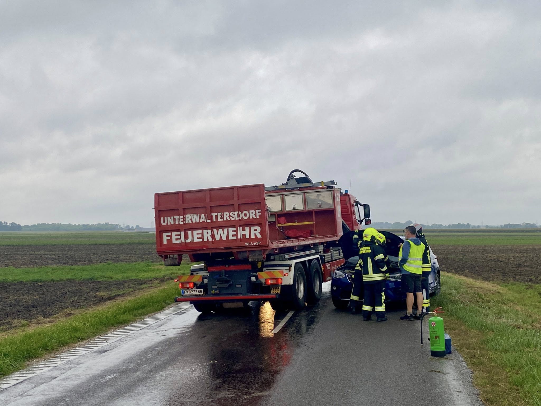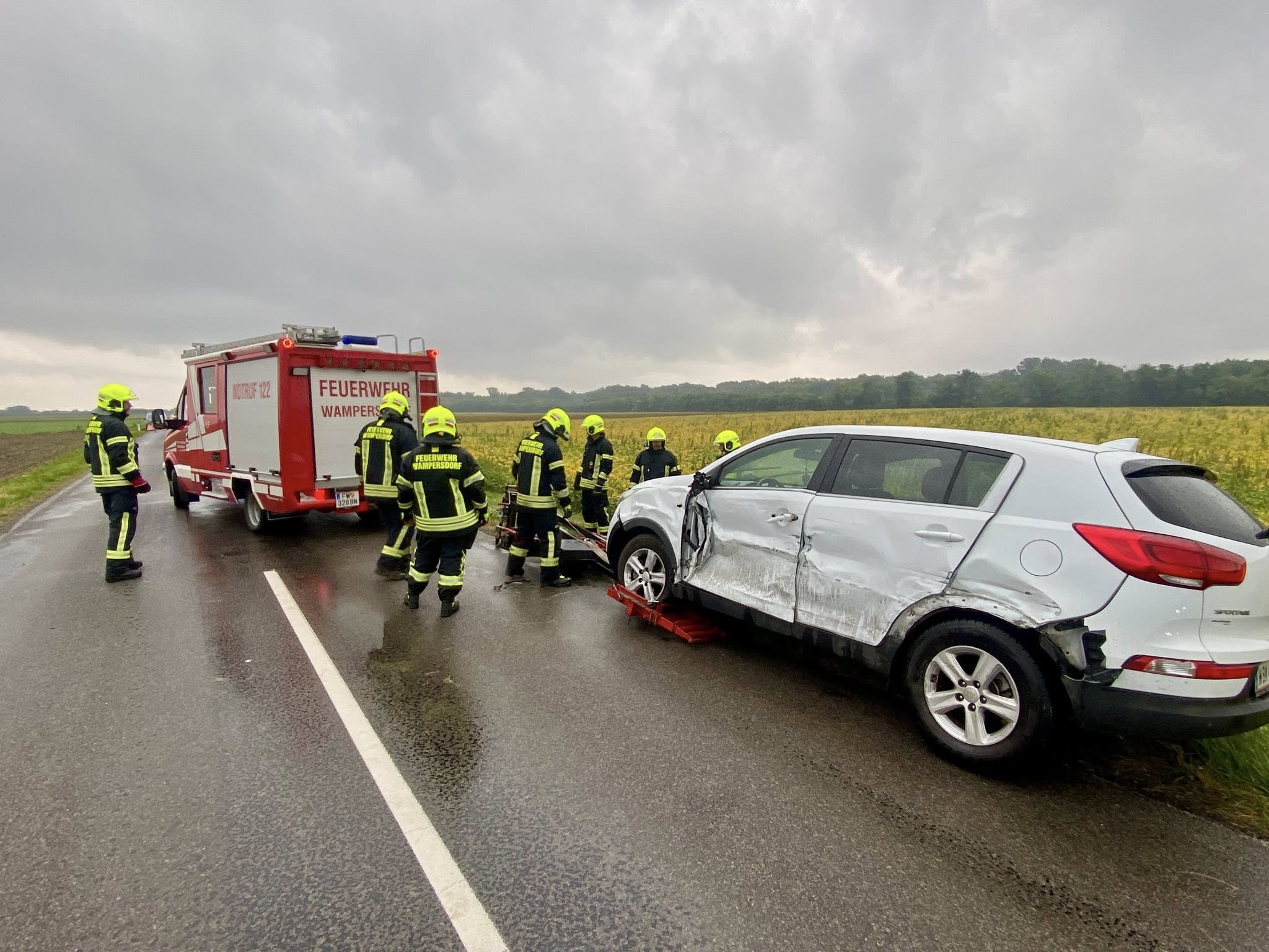 Die Feuerwehr Wampersdorf sicherte die Unfallstelle ab, baute einen Brandschutz auf und versorgte eine verletzte Person bis zum Eintreffen des nachgeforderten RTW.