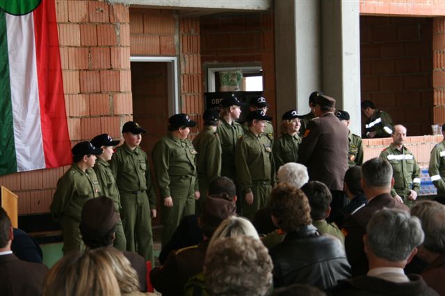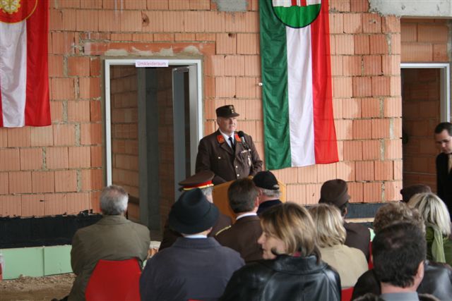 Um 14 Uhr begann in der Fahrzeughalle der Festakt mit der Begrüßung der Ehrengäste durch Feuerwehrkommandant HBI Gerhard Leitgeb. Es freute ihn besonders, einige der zahlreich erschienenen Ehrengäste namentlich begrüßen zu dürfen, darunter Feuerwehrkurat Mag. Wilfried Wallner, an der Spitze der politischen Vertreter Hausherrn und Bürgermeister Ing. Thomas Sabbata-Valteiner, Landtagsabgeordneten Helmut Doppler und stellvertretend für die zahlreich anwesenden Mitglieder des Gemeinderates Ortsvorsteher GGR Ludwig Tuschek. Auch viele Vertreter der umliegenden Gemeinden waren der Einladung zur Gleichenfeier gefolgt: Der Bürgermeister der Gemeinde Blumau-Neurisshof Gernot Pauer, der Vizebürgermeister der Gemeinde Wimpassing Mag. Johann Koller und der Vizebürgermeister der Stadtgemeinde Ebenfurth Siegbert Sabbata-Valteiner.