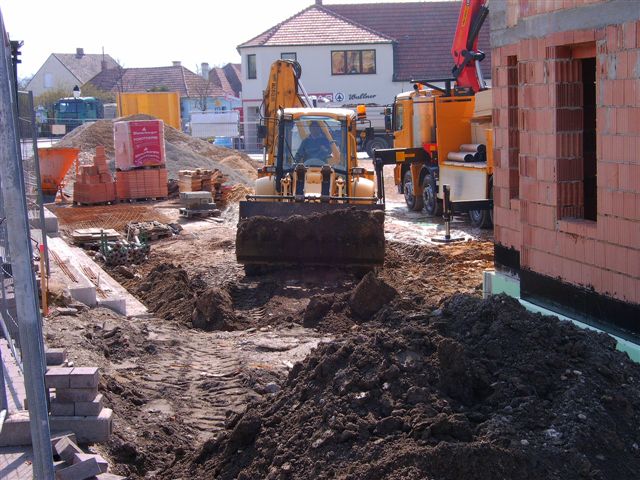In den letzten Märztagen 2008 wurde der Platz vor der Fahrzeughalle planiert. Außerdem wurden noch noch Kanal- und andere Rohre verlegt und das Fundament für den Zaun hinter dem Mannschaftsgebäude gegossen. Das Wartehäuschen der Busstation wurde neu angeliefert - es war ja seit einem Verkehrsunfall Ende 2007 beschädigt - und auf einem in das Grundstück hineinversetzte Plateu montiert. In den ersten beiden Aprilwochen wurden die Arbeiten fortgesetzt. Zusätzlich zum Kanal wurden auch Halterungen für die Fahnenmaste mit Beton gegossen.
