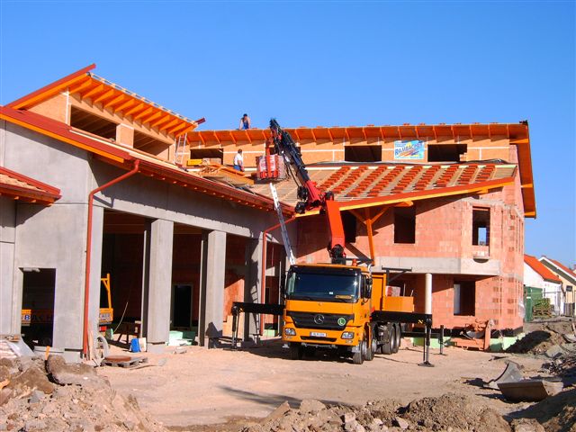 In der zweiten Aprilwoche 2008, beginnend am 7. April, wurde mit den Arbeiten zur Fertigstellung des Dachs von der Fa. Rambacher begonnen. Am Montag und am Dienstag wurden die Dachrinnen aus Kupfer montiert. Am Mittwoch wurde mit dem Verlegen der hellroten Dachziegel begonnen - per LKW-Ladekran wurden sie direkt auf das Dach gehievt, wo sie dann von den Dachdeckern verlegt wurden. Am Ende dieser Woche war bereits die Rückseite des Mannschaftsgebäudes fertig eingedeckt. In der dritten Aprilwoche, genauer am 17. April 2008, war das Dach dann fertig eingedeckt.