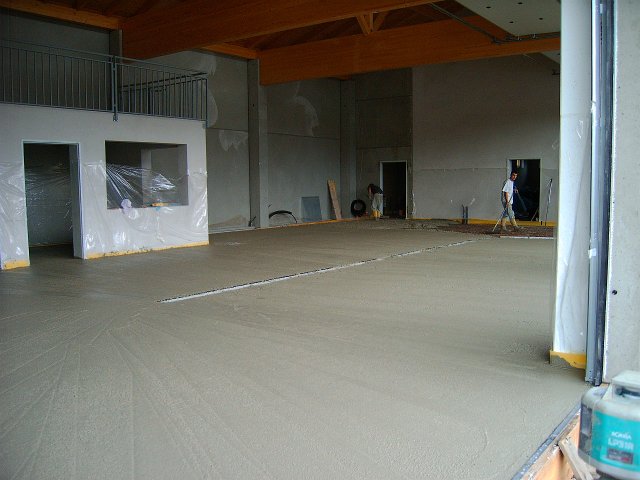 Anfang August wurde die Fahrzeughalle, die bis dato lediglich beschüttet war, zunächst planiert. Danach wurden Styrodur-Platten, Baustahl-Gitter und die Fußbodenheizung verlegt. Die Styrodur-Platten dienen der Isolierung, sie verhindern, dass die Fußbodenheizung nach unten heizt. Am 9. August 2008 wurde die Bodenplatte betoniert und gleich in Anschluss der Industrieboden aufgetragen. In der dritten Augustwoche wurden dann die Abflussgitter sowie die Schlauchwaschanlage, die im Gegensatz zum alten Feuerwehrhaus horizontal konzipiert ist, montiert.
