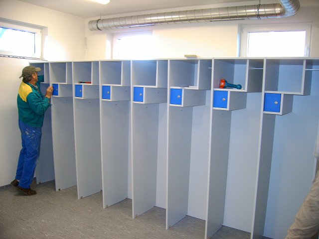 Nach intensiver Planungsarbeit und einem Modell in Originalgröße war es am 20. September 2008 soweit: Es wurde mit dem Bau der Spinde für die Garderobe begonnen. Zuerst schweißten einige Mann der FF Wampersdorf Untergestelle aus Profilrohren, auf denen in weiterer Folge die Spinde aufgebaut werden. Die Spinde werden aus Kunststoff-Möbelplatten gefertigt und werden eine Breite von ca. 55 cm haben. Neben einem Helmfach und einer eigenen Aufhängung für den Einsatzoverall werden die Spinde auch über ein verschließbares Fach für Wertgegenstände verfügen. In der zweiten Oktoberwoche wurden die einzelnen Teile mit Hilfe einer CNC-Fräsmaschine zugeschnitten, in der dritten Oktoberwoche wurden alle notwendigen Kleinteile wie Schrauben oder Holzdübel an den Einzelteilen angebracht. Schließlich wurden die Garderobenspinde am 18. Oktober 2008 montiert und die Bodenbleche angefertigt.