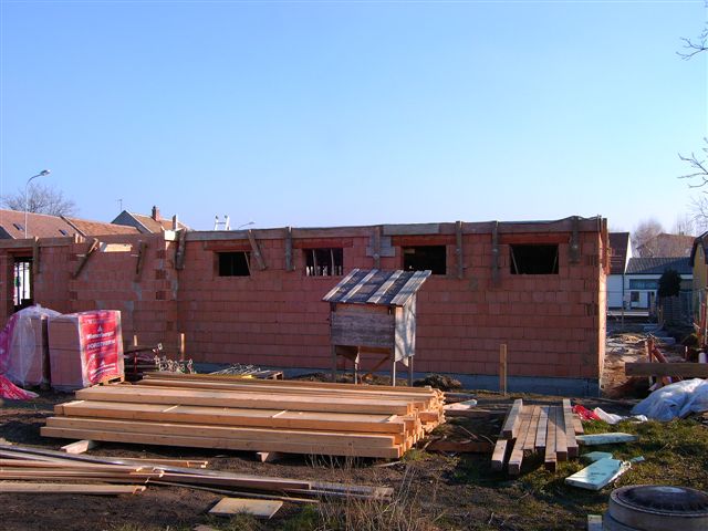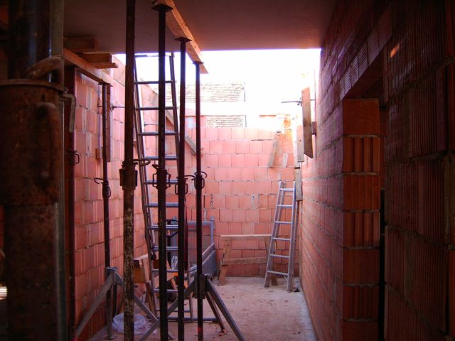Genau am 1. Februar 2008 wurde mit den Arbeiten für die Decke für das Erdgeschoß begonnen. Betoniert wurde die Decke, nachdem sie entsprechend abgestützt war, am 8. Februar 2008 mit Hilfe eines Betonlifts. Die Decke besteht aus eine 5cm Elementdecke mit 15cm Aufbeton. Die erforderliche Zulagenbewährung wurde bauseitig verlegt. Teilweise wurde in der Decke bereits die Leerverrohrung für die Elektroinstallationen eingelegt.
