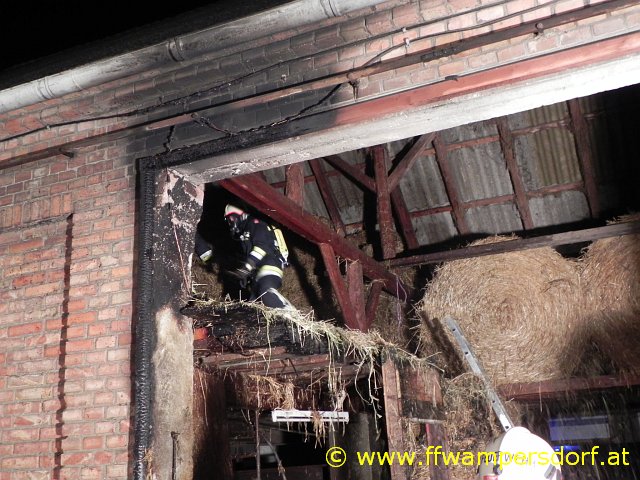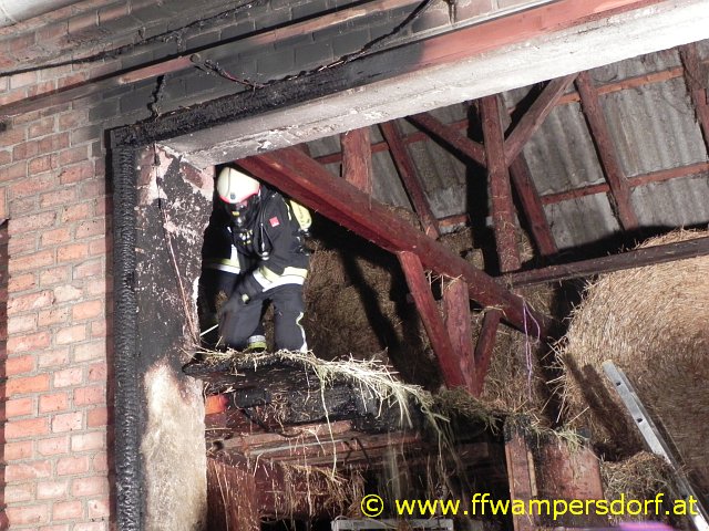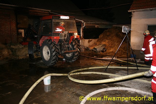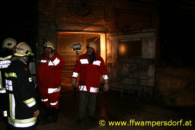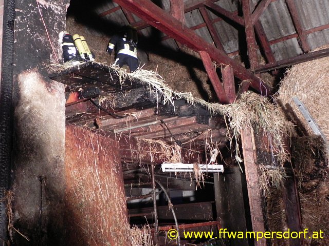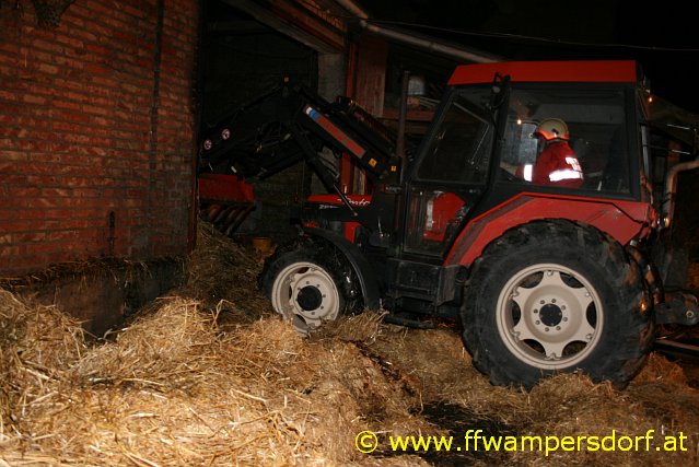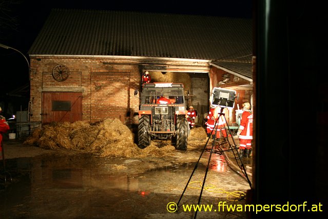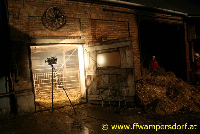 Aufgabe der Feuerwehr Wampersdorf war die Errichtung einer Einsatzleitstelle und eines Atemschutzsammelplatzes sowie die Bereitstellung eines Atemschutztrupps, welcher im Einsatzverlauf zum Ausräumen der noch teilweise qualmenden Strohballen angefordert wurde. Leider wurde bei dieser Tätigkeit ein Atemschutzgeräteträger am Handgelenk leicht verletzt und musste vom Roten Kreuz Landegg-Ebenfurth in ein umliegendes Krankenhaus eingeliefert werden. Nach ambulanter Behandlung konnte aber Entwarnung gegeben werden - die Hand war zwar stark geprellt, aber nicht gebrochen oder abgesplittert.