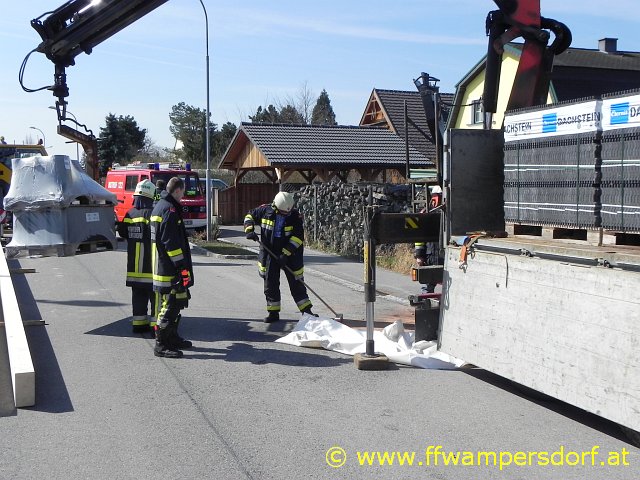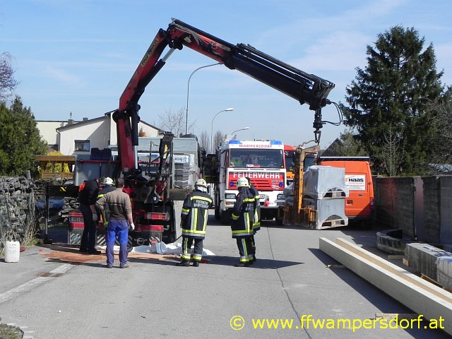 Von der Einsatzmannschaft der Feuerwehr Wampersdorf wurde die Einsatzstelle abgesichert, das ausgelaufene Hydrauliköl mittels Bindemittel gebunden und somit die Straße bzw. der Gehsteig wieder gesäubert.