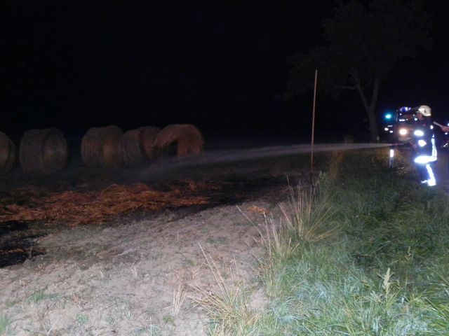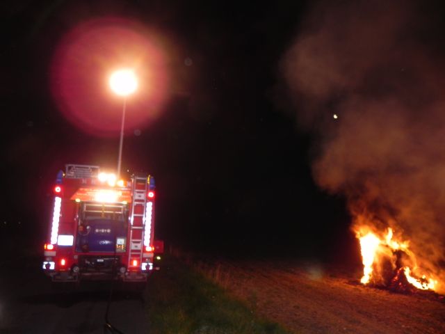 Als das RLFA als erstes Fahrzeug am Einsatzort eintraf, standen bereits einige Strohrundballen in Vollbrand. Sofort wurde daher die Einsatzstelle abgesichert und mittels Hochdruckstrahlrohr die noch nicht in Brand stehenden Strohballen befeuchtet. Gleichzeitig wurden die brennenden Rundballen mit Feuerhaken zerteilt.