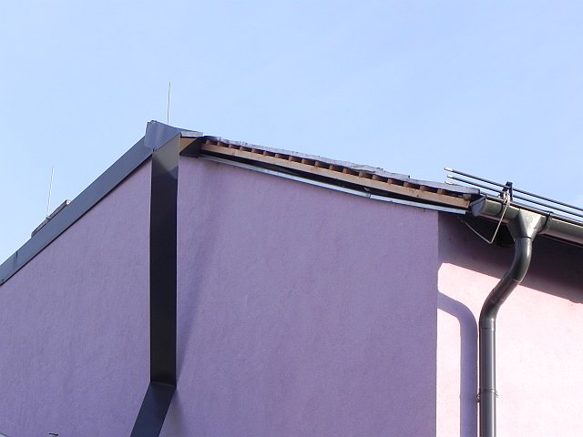 Sturmböen dürften ein Blechelement an einem Hausdach erfasst und aus der befestigten Verankerung gerissen haben, sodass dieses senkrecht an der Hauswand hinunter hing.