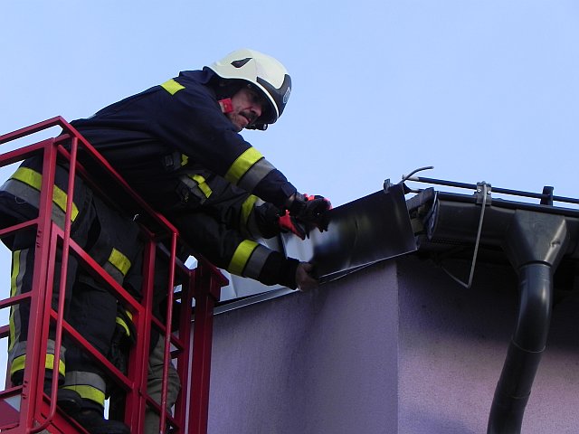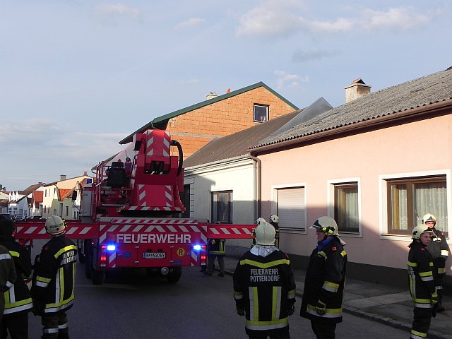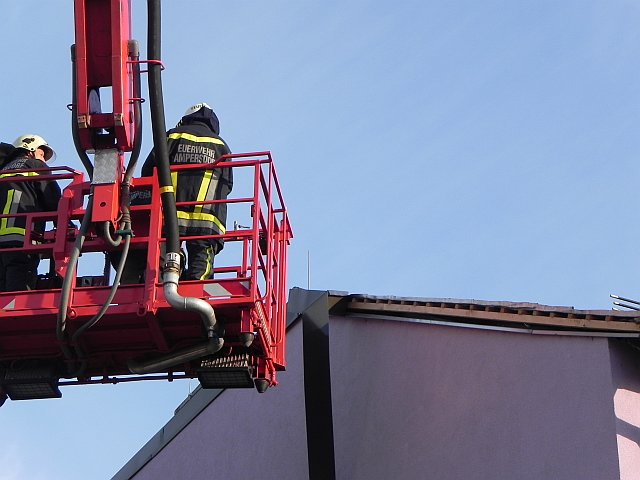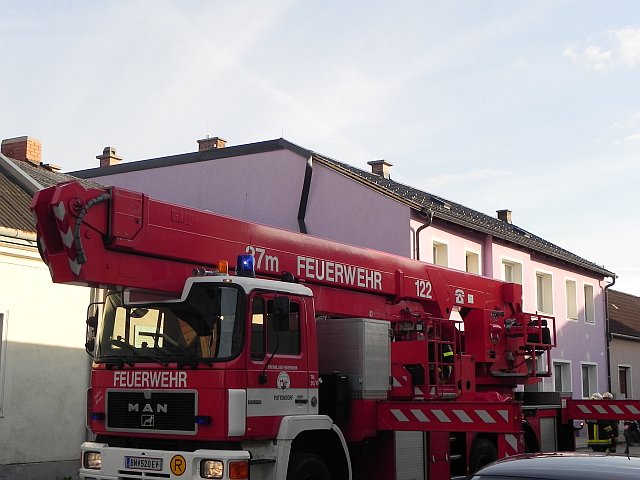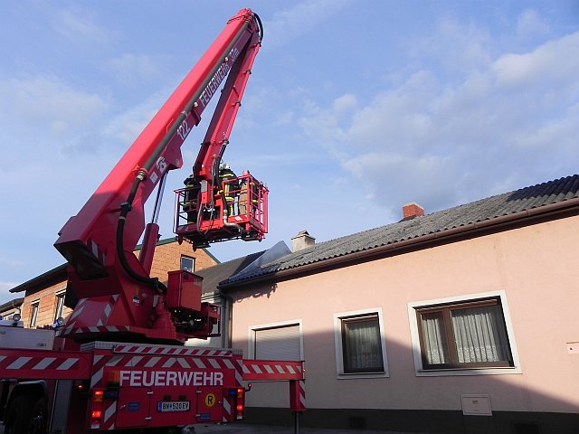 Da ein sicherer Aufstieg zu dem Blechelement mittels einer Leiter nicht möglich war, wurde vom Einsatzleiter das Hubrettungsgerät der Feuerwehr Pottendorf nachalarmiert. Nachdem das Hubrettungsgerät in Stellung gebracht war, konnte das Blechelement provisorisch befestigt werden.