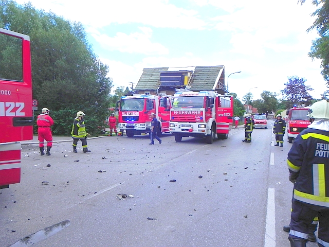 Nachdem die örtlich zuständige Feuerwehr Pottendorf sowie die Feuerwehr Landegg erste Löschmaßnahmen einleiteten wurde die Alarmstufe erhöht und gegen 11:30 Uhr die Feuerwehr Wampersdorf mit dem Einsatzwortlaut „Flachdach in Vollbrand“ nach Pottendorf alarmiert. Binnen weniger Minuten konnte das Rüstlöschfahrzeug, das Löschfahrzeug sowie das Kleinlöschfahrzeug besetzt und der Einsatzort in Pottendorf angefahren werden.