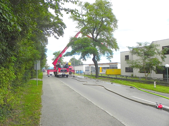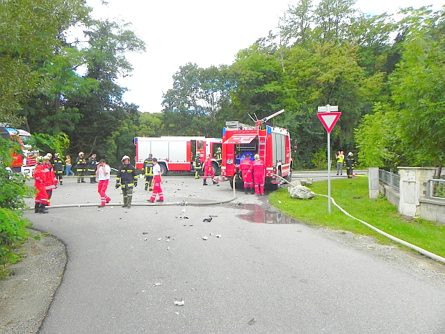 Es gestaltete sich die Brandbekämpfung für die Feuerwehreinsatzkräfte äußerst schwierig, da durch die Explosionen am Flachdach ein Teil der Decke eingestürzt und mit weiteren Explosionen von noch im Gebäude befindlichen Gasflaschen zu rechnen war. Zusätzlich hieß es dann noch, dass sich noch weitere fünf Arbeiter im Gebäude befinden sollen. 2 Arbeiter konnte dann aufgegriffen werden. Die anderen Arbeiter dürften aber noch vor Eintreffen der Einsatzkräfte davon gelaufen sein. Diesbezüglich nahmen die ebenfalls alarmierten Polizeieinsatzkräfte die Arbeiten auf. Weitere Gasflaschen wurden von den Feuerwehreinsatzkräften in Sicherheit gebracht. Während des Einsatzes wurde mehrere Lagebesprechung mit den Gruppen-bzw. Fahrzeugkommandanten zwecks Lageabgleich durchgeführt.