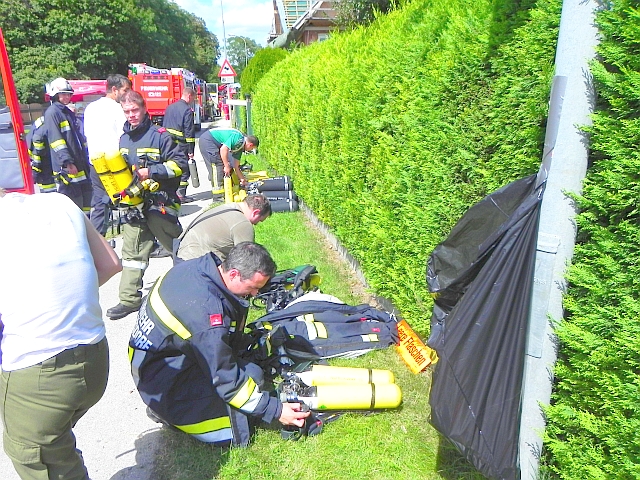 Während der Anfahrt rüsteten sich bereits zwei Atemschutztrupp für den bevorstehenden Einsatz aus. Am Einsatzort wurden die nachrückenden Einsatzkräfte bereits vom Einsatzleiter HBI Adolf Pfingstl empfangen.