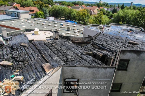 Auf einem Flachdach eines Bürogebäudes in Pottendorf kam es nach Flämmarbeiten zu einem Brandausbruch welcher rasch außer Kontrolle geriet.