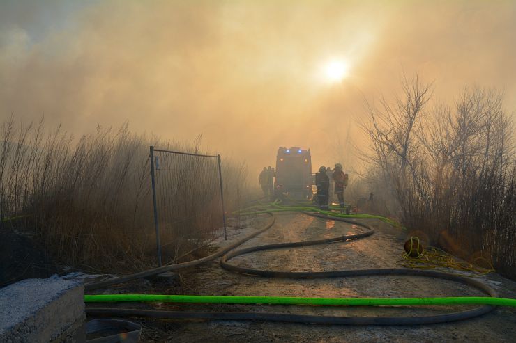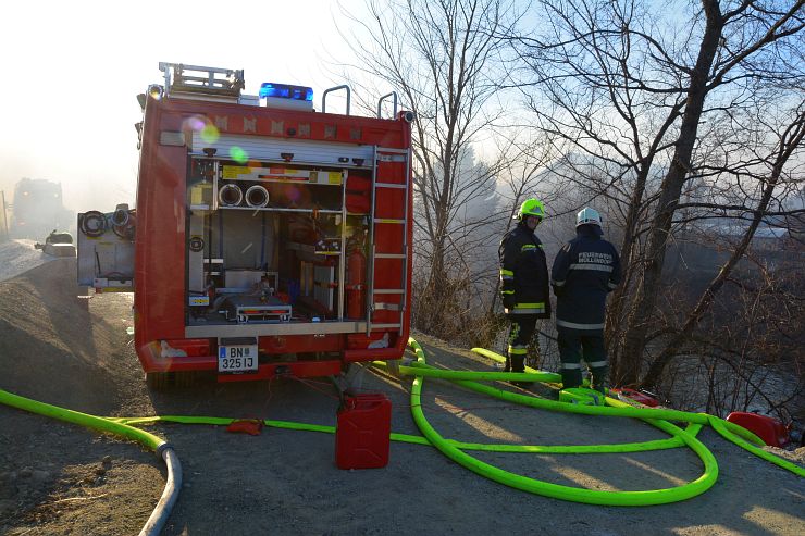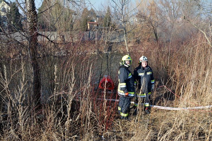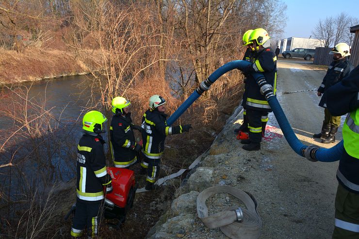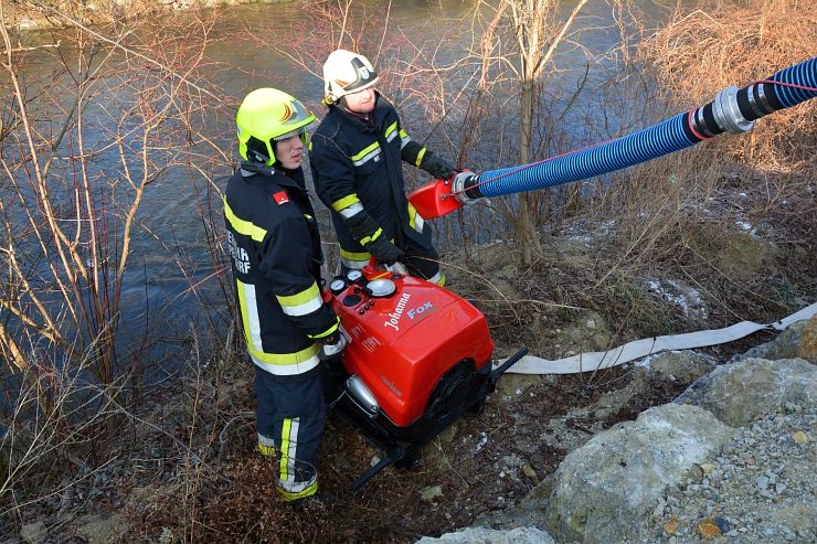 Zwischenzeitlich brachte unsere Löschgruppenmannschaft die Tragkraftspritze neben der Leitha in Stellung. Hierbei hat sich gezeigt, dass die Investition in den Schwimmsauger, die Richtige war. So konnten in kürzester Zeit zwei B Leitung zur weiteren Brandbekämpfung im Außenbereich vorgenommen werden.