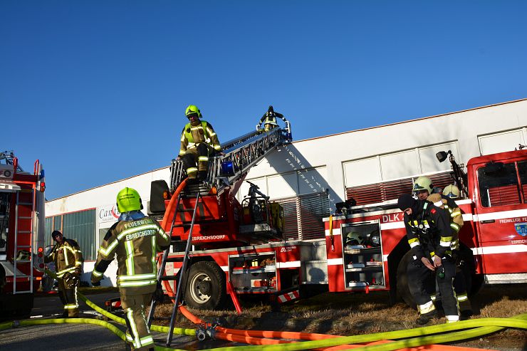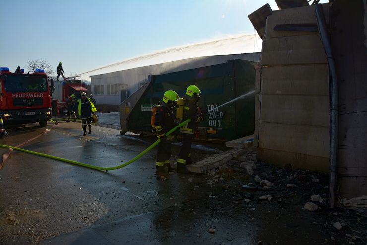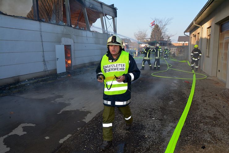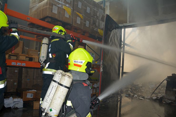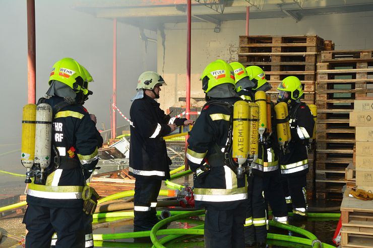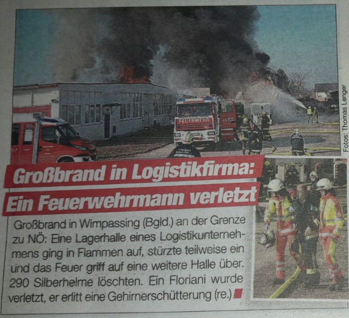 Nach Meldung beim Einsatzleiter der Feuerwehr Wimpassing bekam unser RLF den Einsatzbefehl für einen umfassenden Außenlöschangriff mittels des Wasserwerfer sowie 2 C Rohren. Weiters unterstützte der erste Atemschutztrupp die Brandbekämpfung im Inneren der Logistikhalle ebenfalls mit einem C Rohr. Zu diesem Zeitpunkt stand die Halle bereits im Vollbrand. Durch die enorme Wärmestrahlung musste der Innenangriff vorerst abgebrochen werden, da Einsturzgefahr bestand und Teile der Deckenkonstruktion bereits nachgaben.