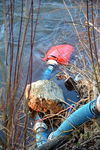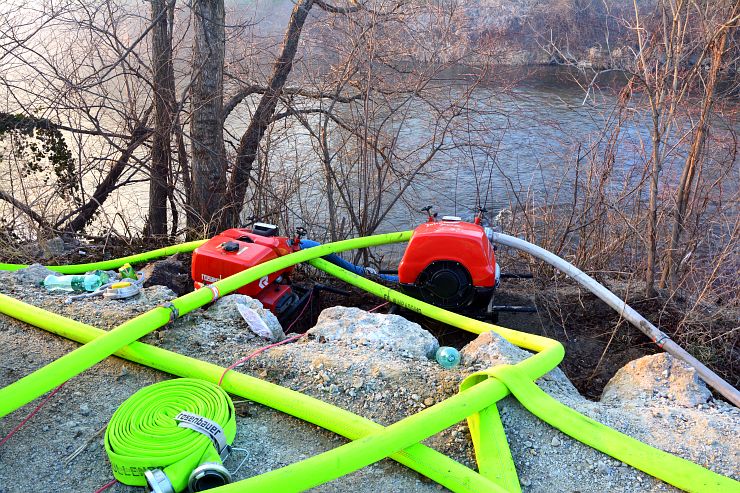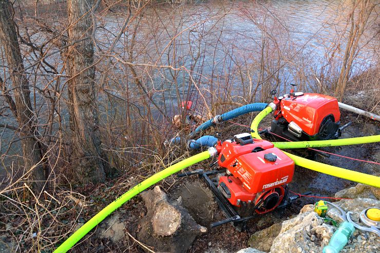 Die Mannschaft unseres KLF brachte die zweite Tragkraftspritze auch direkt neben der Leitha in Stellung und legte zwei Relaisleitung zur Versorgung der weiteren Tanklöschfahrzeuge. Schlussendlich wurde auch die Tauchpumpe unseres LF in die Leitha gesetzt. Auch hier wurde eine Relaisleitung aufgebaut.