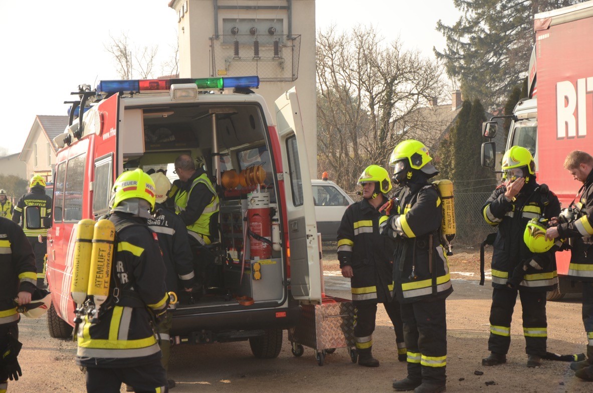 FF Wampersdorf (RLFA 2000, LF, KLF, MTF und 27 Mann, 9 Atemschutztrupps mehrmals im Einsatz)