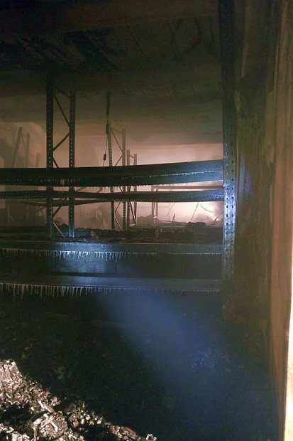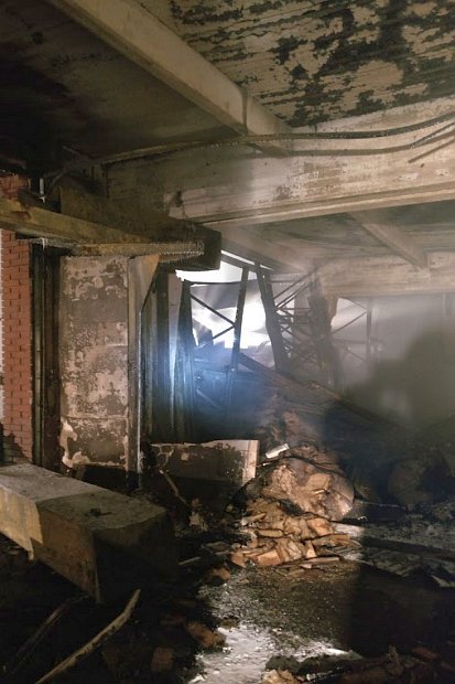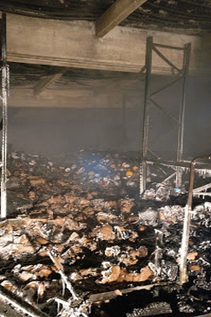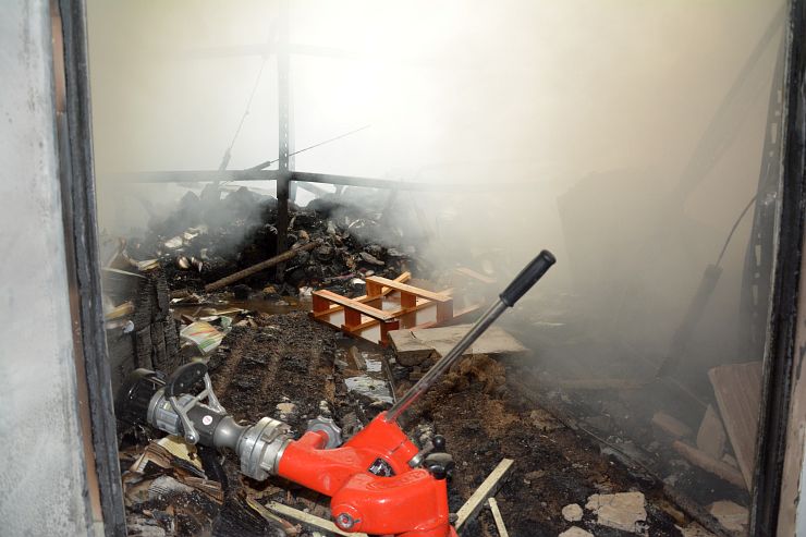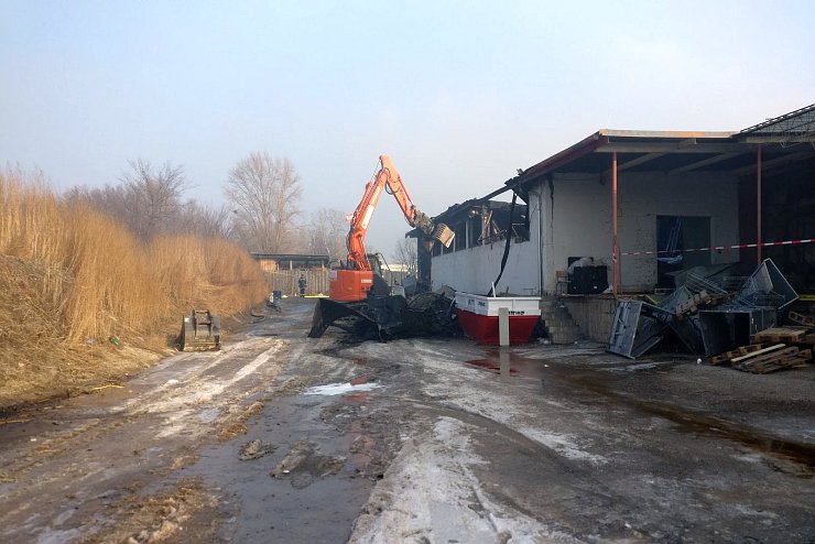 Durch den Einsatz eines Baggers wurde die durch den Brand zerstörten Hallen, teilweise abgetragen um an die Brandherde und Glutnester zu gelangen.