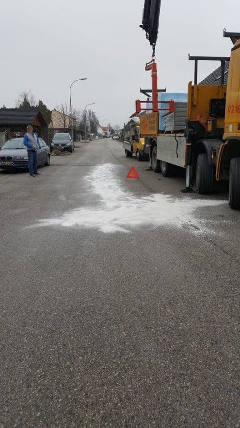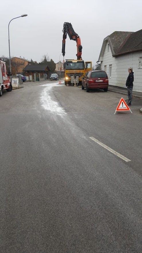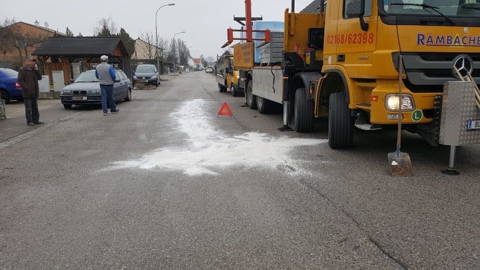 Einige Liter Hydrauliköl traten aus und verunreinigte die Straße. Die Feuerwehr Wampersdorf wurde kurz nach 10:30 Uhr über die Feuerwehr-Bezirksalarmzentrale Baden zu dem Schadstoffeinsatz alarmiert. Nach Eintreffen an der Einsatzstelle und Lageerkundung durch den Feuerwehreinsatzleiter begannen die Einsatzkräfte großflächig Bindemittel auf die kontaminierte Fahrbahn aufzutragen und den Einsatzbereich abzusichern.