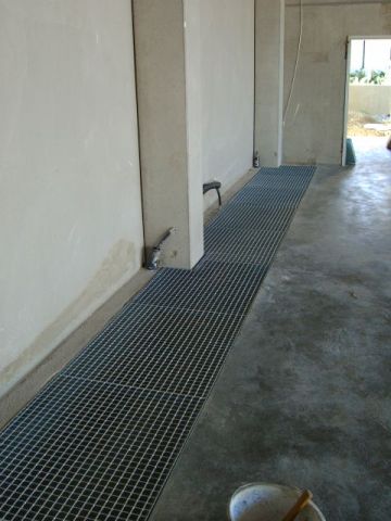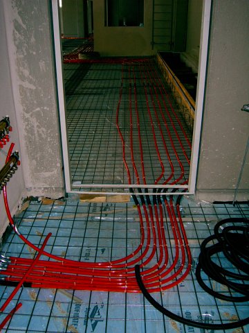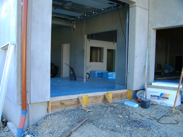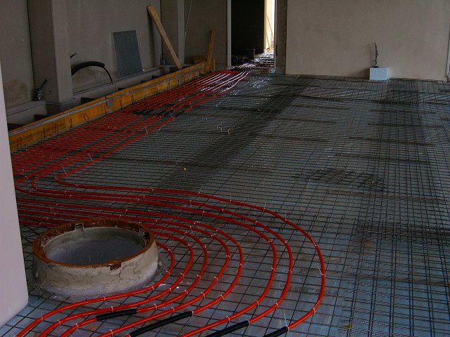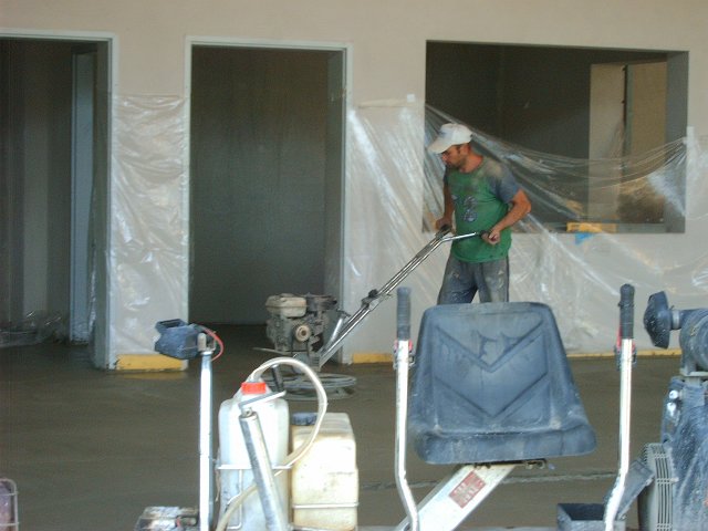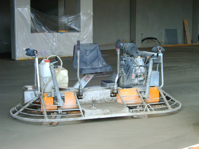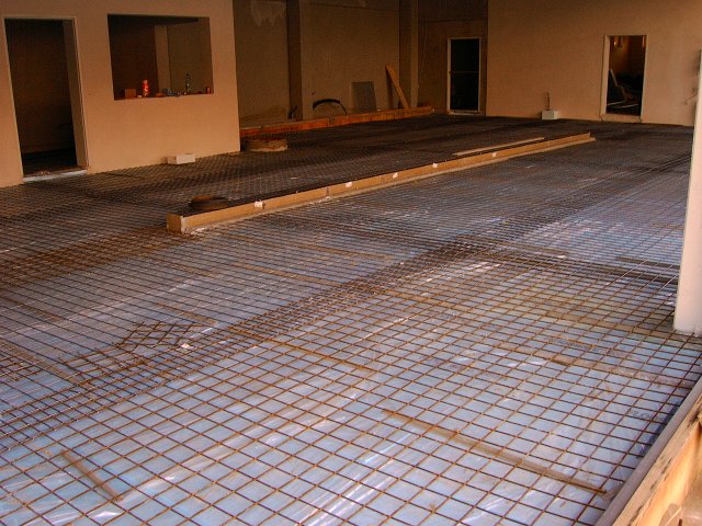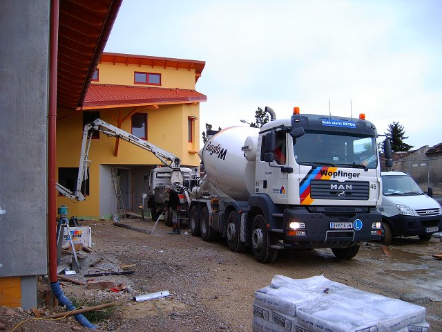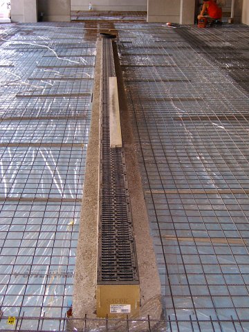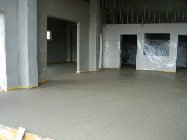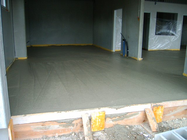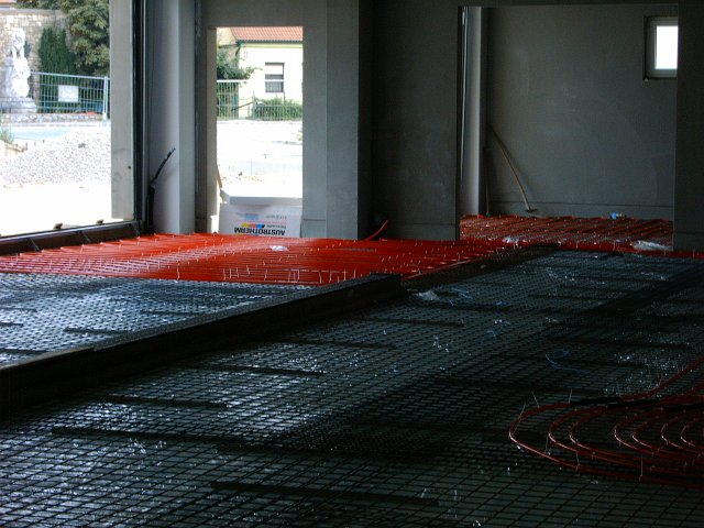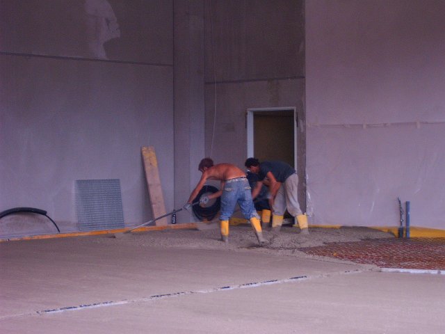 Anfang August wurde die Fahrzeughalle, die bis dato lediglich beschüttet war, zunächst planiert. Danach wurden Styrodur-Platten, Baustahl-Gitter und die Fußbodenheizung verlegt. Die Styrodur-Platten dienen der Isolierung, sie verhindern, dass die Fußbodenheizung nach unten heizt. Am 9. August 2008 wurde die Bodenplatte betoniert und gleich in Anschluss der Industrieboden aufgetragen. In der dritten Augustwoche wurden dann die Abflussgitter sowie die Schlauchwaschanlage, die im Gegensatz zum alten Feuerwehrhaus horizontal konzipiert ist, montiert.