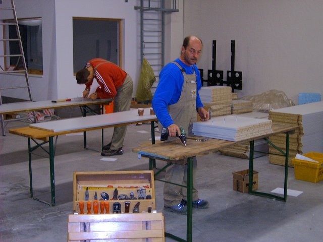 Nach intensiver Planungsarbeit und einem Modell in Originalgröße war es am 20. September 2008 soweit: Es wurde mit dem Bau der Spinde für die Garderobe begonnen. Zuerst schweißten einige Mann der FF Wampersdorf Untergestelle aus Profilrohren, auf denen in weiterer Folge die Spinde aufgebaut werden. Die Spinde werden aus Kunststoff-Möbelplatten gefertigt und werden eine Breite von ca. 55 cm haben. Neben einem Helmfach und einer eigenen Aufhängung für den Einsatzoverall werden die Spinde auch über ein verschließbares Fach für Wertgegenstände verfügen. In der zweiten Oktoberwoche wurden die einzelnen Teile mit Hilfe einer CNC-Fräsmaschine zugeschnitten, in der dritten Oktoberwoche wurden alle notwendigen Kleinteile wie Schrauben oder Holzdübel an den Einzelteilen angebracht. Schließlich wurden die Garderobenspinde am 18. Oktober 2008 montiert und die Bodenbleche angefertigt.
