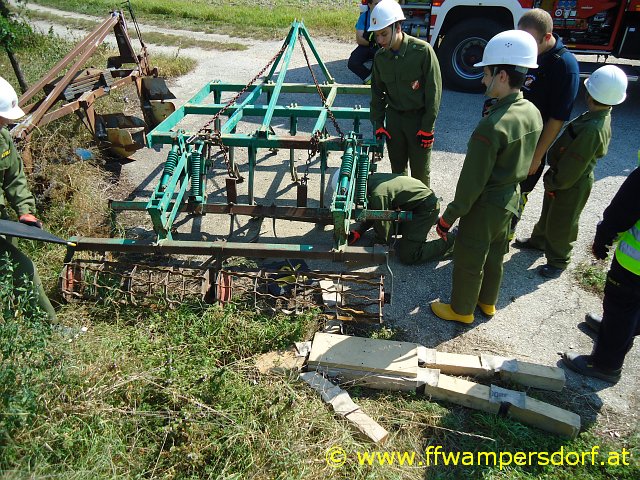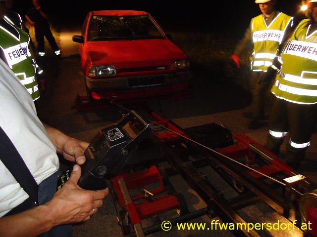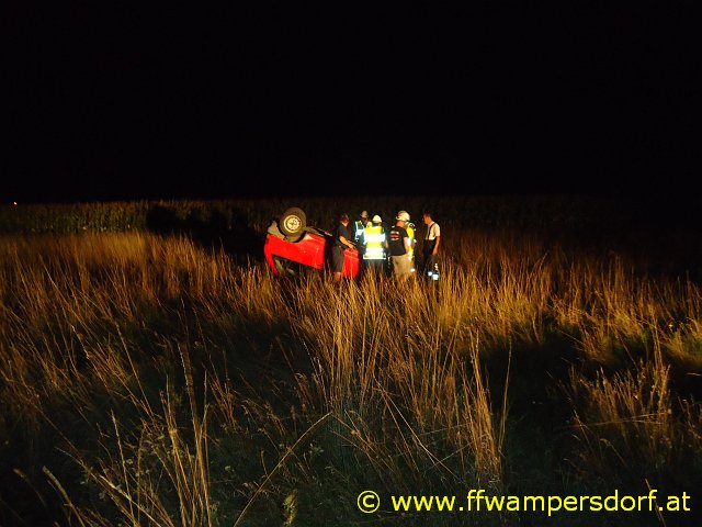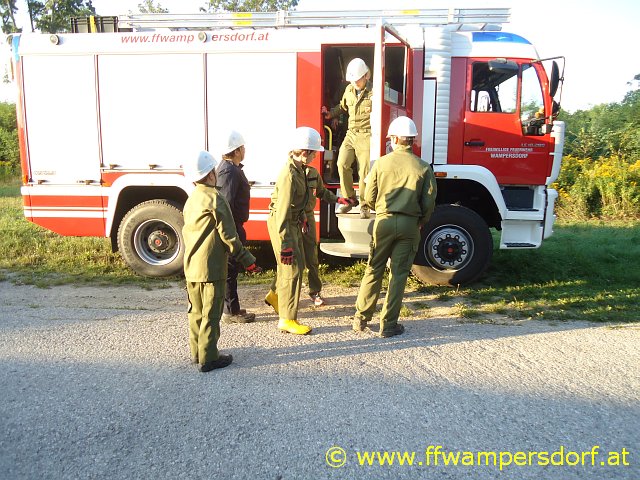Nach einem Fußballspiel ließ man den Tag mit einem gemeinsamen Grillabend ausklingen. Um 22:00 Uhr war es wieder soweit, die Handys piepsten abermals: „Hier Florian Wampersdorf, Technischer Einsatz für die Feuerwehrjugend, Fahrzeugbergung in den Weingärten – PKW am Dach“. Nach sofortigem Ausrüsten begab man sich zum Einsatzort wo der Einsatzleiter sofort die Lage erkundete. Der PKW wurde mittels Seilwinde aus dem Feld gezogen und mit der Abschleppachse auf einem gesicherten Abstellplatz verbracht. Gegen 23:00 Uhr konnte die Einsatzbereitschaft wieder hergestellt und die verdiente Nachtruhe angetreten werden.