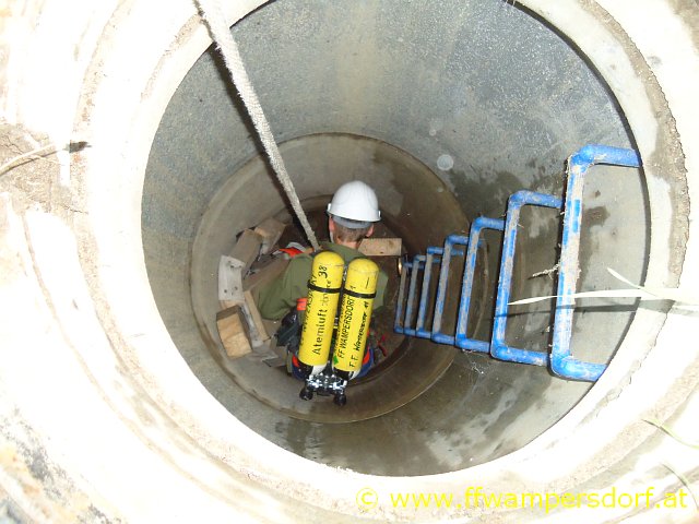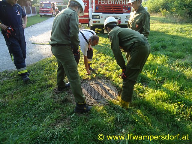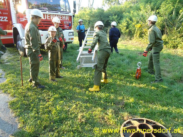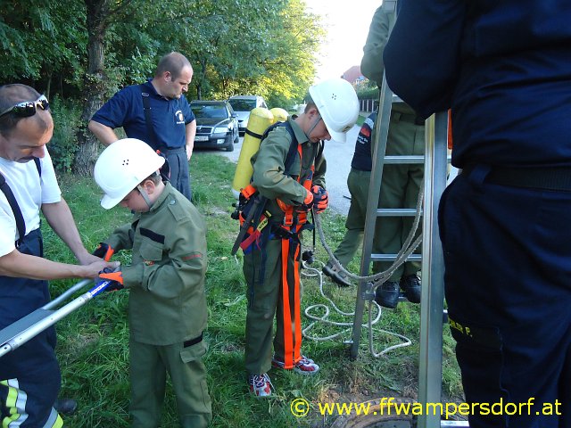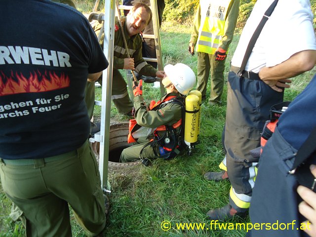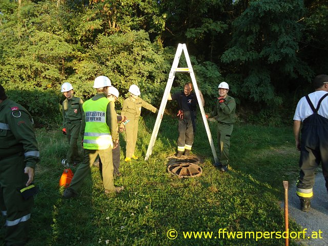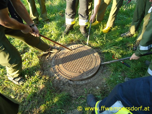 Gegen 18:30 Uhr ging der erste Alarm via Einsatz SMS bei den Jungs ein. „Hier Florian Wampersdorf, Technischer Einsatz für Feuerwehrjugend, Person in Kanalschacht gestürzt“. Innerhalb einer Minute waren die Fahrzeuge besetzt und die Feuerwehrjugend war unterwegs zu ihrer ersten Einsatzübung im Rahmen des „24 Stunden Actionday“. Nach dem Absichern der Einsatzstelle bauten die Jugendlichen eine „Brücke“ (zwei verbundene Steckleiternteile) über den offenen Kanalschacht auf. In weiterer Folge wurde mittels Umlenkrolle ein „Flaschenzug“ angebracht und ein Mitglied nach unten gelassen. Der „Verunfallte“ wurde mittels Dreiecksschlinge sachgemäß aus dem Kanalschacht gerettet.