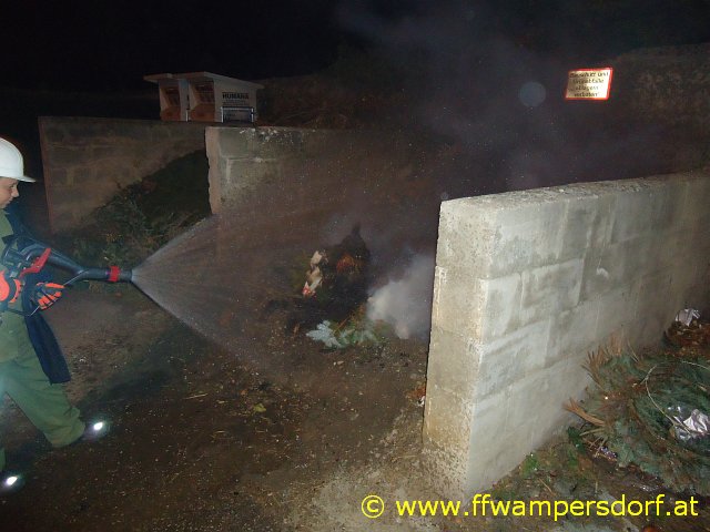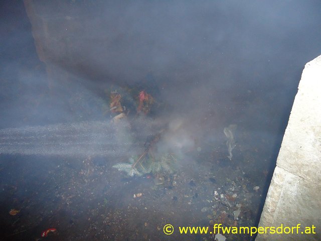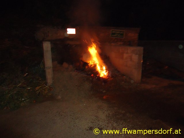 Doch die Nachtruhe war nur von kurzer Dauer. „01:00 Uhr, Hier Florian Wamperdsorf, Brandeinsatz für die Feuerwehrjugend, Müllcontainerbrand beim Friedhof“. Mit müden Augen und zittrigen Knien rückten die Jung-Feuerwehrmitglieder zu diesem Einsatz aus. Schon bei der Anfahrt konnte man die Flammen von weitem sehen. Das Brandgut wurde mit Einreißhaken zerteilt und mittels Hochdruckrohr abgelöscht.