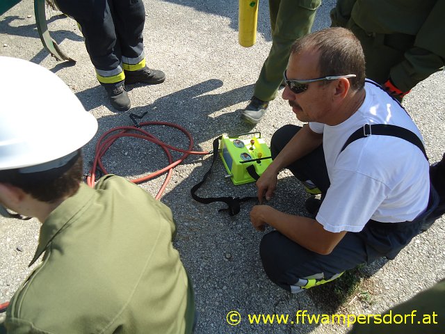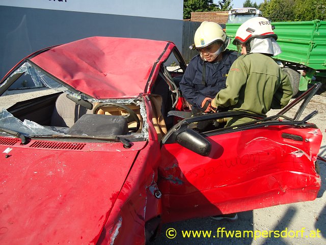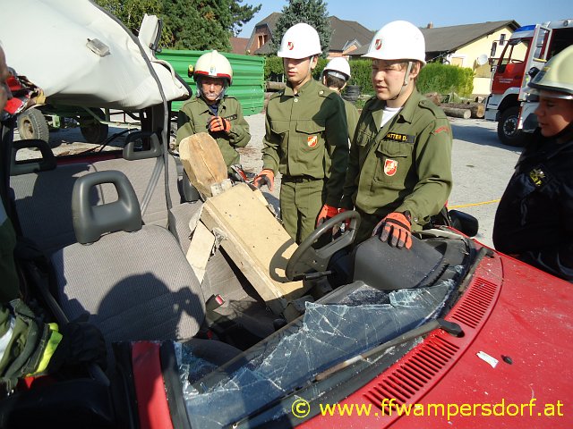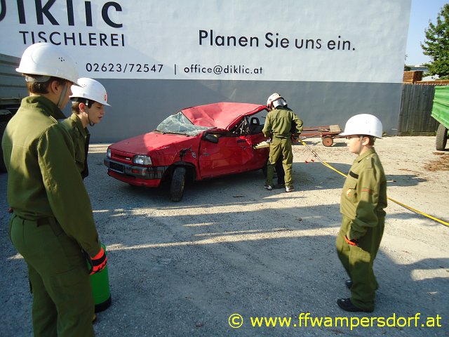 Bei einem ausgiebigen Frühstück ließ man die einsatzreiche Nacht revue passieren – doch dann der nächste Alarm: „Hier Florian Wampersdorf, Technischer Einsatz für die Feuerwehrjugend, Menschenrettung nach Verkehrsunfall“. Am Einsatzort angekommen wurde ein schwer beschädigter PKW vorgefunden in welchem eine verletzte Person eingeklemmt war. Der hydraulische Rettungssatz wurde in Stellung gebracht und die Person aus ihrer Zwangslage befreit.