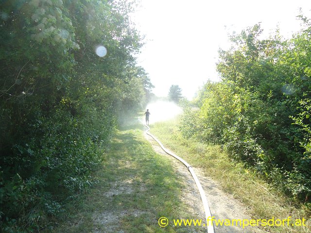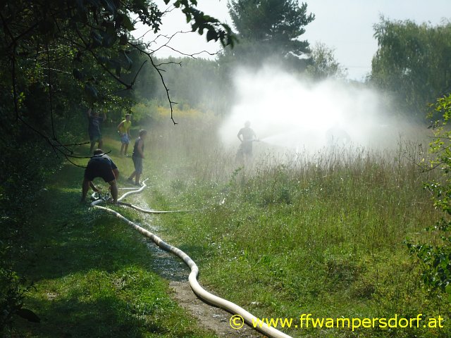 Da die Anzeige des Außenthermometer schon auf heiße 38° geklettert war, musste für ein wenig Abkühlung gesorgt werden. In wenigen Minuten war die Tragkraftspritze beim Löschbrunnen positioniert und man lieferte sich mit 2 C Rohren (bei mäßigem Schlauchdruck) eine kräftige Wasserschlacht.