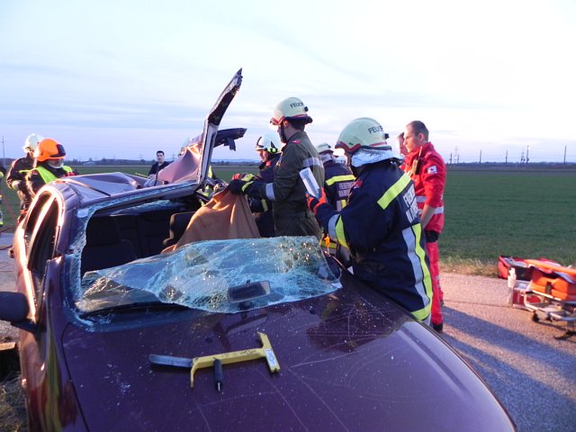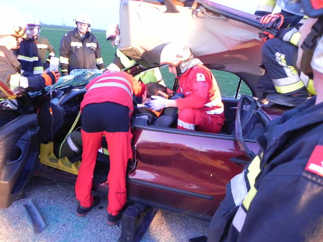 Während eine Rettungsöffnung (Entnahme der Windschutzscheibe – Abtrennung des Fahrzeugdaches) geschaffen wurde, wurde der Verletzte vom RTW-Team psychologisch betreut.