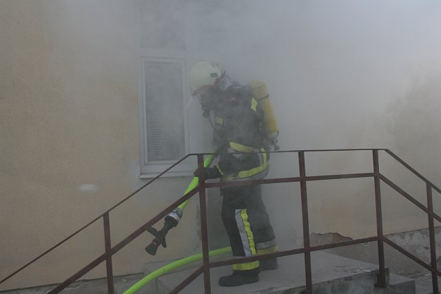 Im Gegensatz zu einer realen Heißübung beschränkten sich die Einsatzkräfte auf die herkömmlichen Übungsbedingungen (künstlicher Rauch, Nebelgerät).
