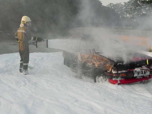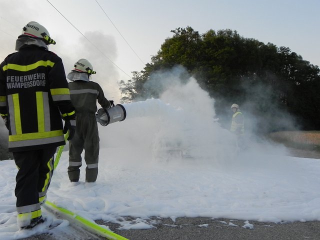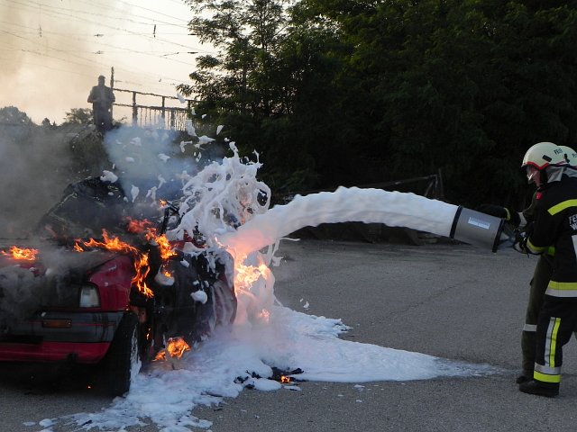 Aufgrund der dichten schwarzen Rauchsäule, welche schon von weitem sichtbar war, trifft der Übungseinsatzleiter die Entscheidung einen Erstlöschangriff mittels Mittelschaumrohr vorzunehmen. Aufgrund der günstigen Windbedingungen wurde entschieden, den PKW-Brand ohne Atemschutz durchführen zu lassen.