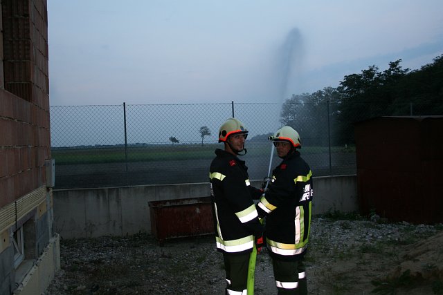 Entsprechend dem Realfall erfolgte daraufhin die Alarmierung der Feuerwehr Wampersdorf, welche mit dem Rüstlöschfahrzeug, dem Kleinlöschfahrzeug sowie dem Mannschaftstransportfahrzeug ausrückt. Nach einer kurzen Lageerkundung gibt der Übungseinsatzleiter der wartenden Einsatzmannschaft seine Befehle: Personenrettung und Erstversorgung aus dem Hackschnitzelsilo – beginnender Innenangriff durch einen Atemschutztrupp mittels „C-Leitung“. Das Kleinlöschfahrzeug sowie das Mannschaftstransportfahrzeug erhalten den Auftrag, zur Wasserversorgung des Rüstlöschfahrzeuges aus einem Feldbrunnen und die nötigen Schritte für einen möglichen Außenangriff vorzubereiten.