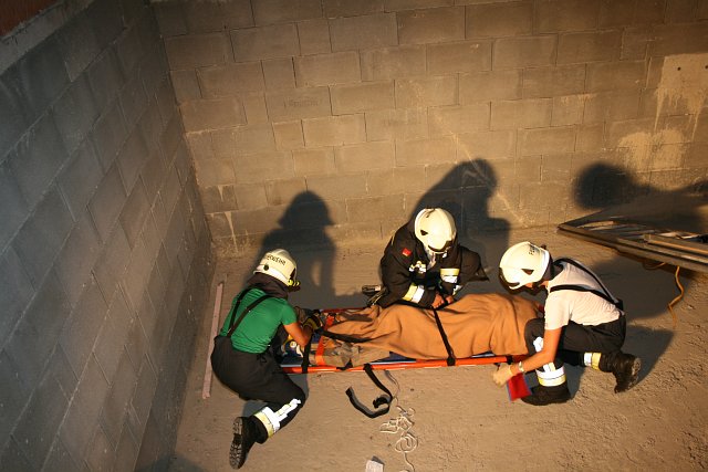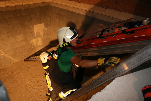 Zwischenzeitlich wurden zwei Steckleiternteile im Hackschnitzelsilo positioniert so dass die Rettungssanitäter der Feuerwehr Wampersdorf zur verletzten Person absteigen konnten. Nach einem traumatologischen Notfallcheck, einem kurzen Monitoring sowie einer Schockbekämpfung konnte die Person stabilisiert werden. Für die Personenrettung wurde der verletzten Person zusätzlich eine HWS-Schiene angelegt, bevor sie mit der Schaufeltrage auf der Korbschleiftrage gelagert wurde. Mit einer Rettungsleine gesichert, wurde die Korbschleiftrage über eine Schiebeleiter aus dem Silo gezogen.
