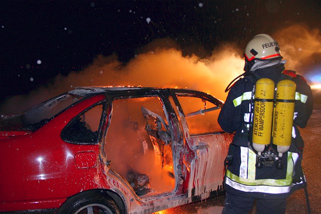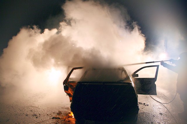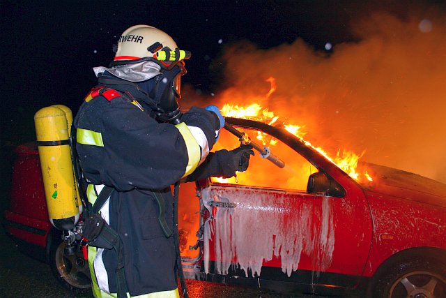Nachdem die Fahrzeugtüren entfernt bzw. geöffnet waren, konnte die eigentliche Einsatzübung, der Fahrzeugbrand, in Angriff genommen werden. Während sich ein Atemschutztrupp für die Löscharbeiten ausrüstete, wurde vom Maschinisten des Löschfahrzeuges die UHPS-Löschanlage in Betrieb genommen. Unter Beachtung der Windrichtung wurde ein primärer Löschangriff unter Atemschutz vorgetragen, welcher auch gleich seine Wirkung zeigte.