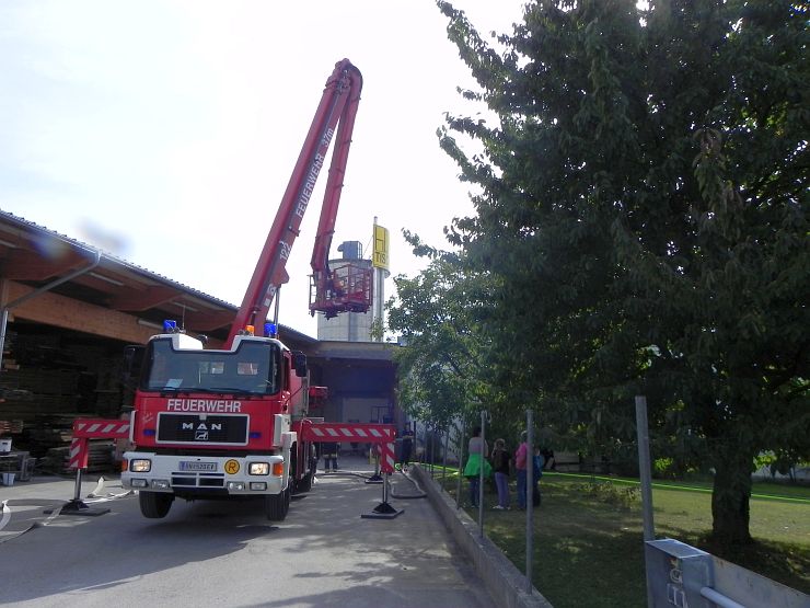 Die FF Landegg und Wimpassing unterstützten währenddessen die Wasserversorgung der Teleskopmastbühne, welche einen umfassenden Außenangriff über die Dachkonstruktion durchführte.