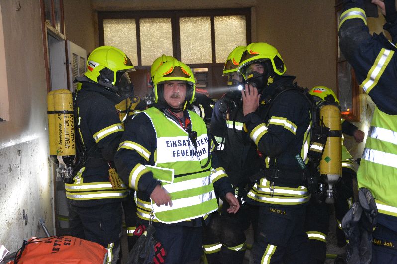 Ab dem ersten Verteiler bereitete der erste Atemschutztrupp seinen Löschangriff vor und drang dann in den völlig verqualmten Brandbereich vor. Der zweite Atemschutztrupp drang zeitgleich mit einer weiteren Löschleitung in den Keller vor.
