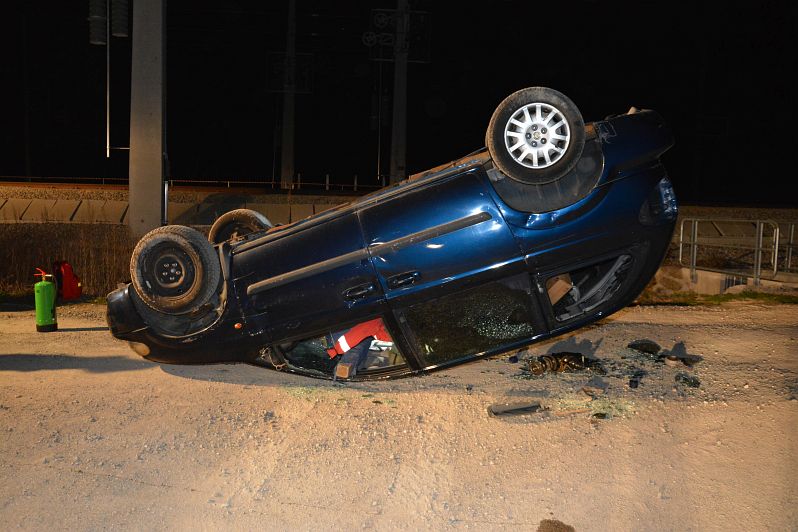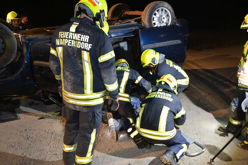 Deshalb wurde der am Dach liegende PKW mit Frontbereich mit mehreren Kanthölzern stabilisiertt um ein sicheres Arbeiten möglich zu machen. Im Anschluss wurden, die im Gurt klemmenden Personen aus der Zwangslage befreit.