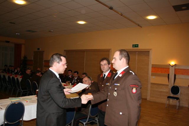 Nach den Berichten der einzelnen Fachchargen und Sachbearbeiter wurde der Vorsitz der Mitgliederversammlung an Bürgermeister Sabbata-Valteiner übergeben. Er bedankte sich namens der Marktgemeinde Pottendorf beim scheidenden Kommando für die erfolgreiche Zusammenarbeit. Er blickte auf die letzte fünfjährige Funktionsperiode zurück und hob die in dieser Zeit erfolgreich durchgeführten Projekte, wie Auslieferung des RLFA 2000, Neubau des Wampersdorfer Feuerwehrhauses, Erhöhung der jährlichen Subventionen, Ankauf einer Wärmebildkamera, Ankauf von Totmannwarngeräten und Festlegung der Fahrzeugpolitik bis 2018 hervor.