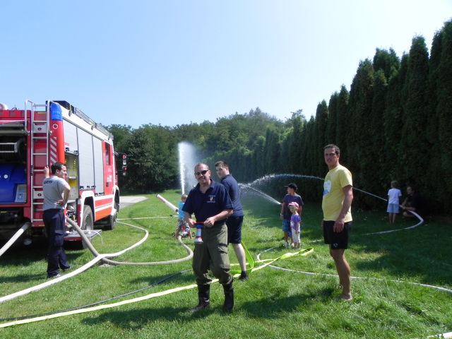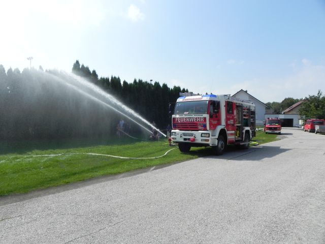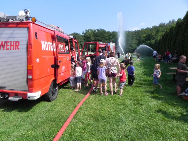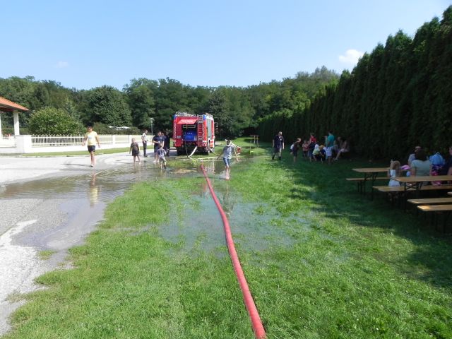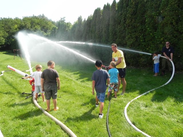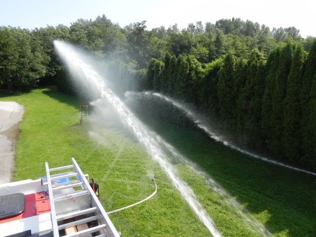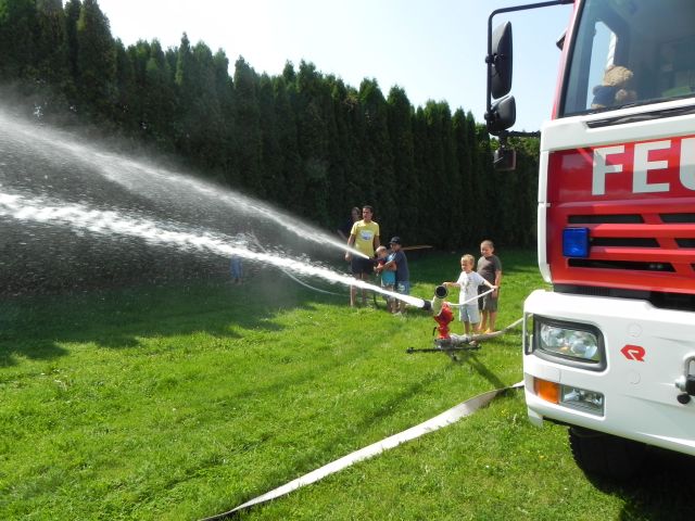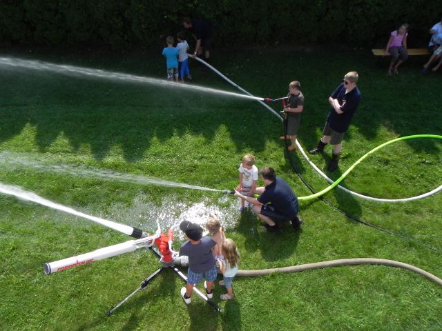 Schlussendlich wurde auch die Wurfweite unseres Wasserwerfers demonstriert, wovon alle Kinder begeistert waren. Bei den hohen Außentemperaturen war es kein Wunder, dass die meisten Kinder eine Abkühlung benötigten und mit nassen Kleidungsstücken nach Hause gingen, das "Ferienspiel" wurde wieder einmal zum "Wasserspiel". Danach gab es noch eine Rundfahrt mit unserem Kleinlöschfahrzeug.