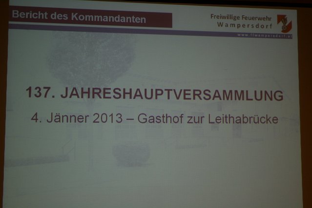 Am Freitag, dem 4. Jänner 2013 fand die 137. Mitgliederversammlung der Freiwilligen Feuerwehr Wampersdorf im Gasthaus zur Leithabrücke statt.