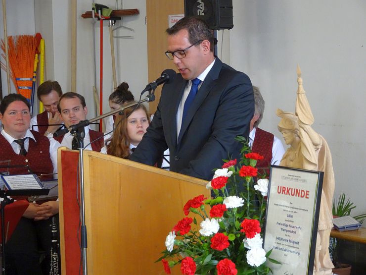 Bgm. Ing. Sabbata-Valteiner bedankte sich in seinen Worten über die ständige Einsatzbereitschaft der Feuerwehren und bei den vielen freiwilligen Helfern ohne die es nicht möglich wäre, ein solches Fest auf die Beine zu stellen. Weiters gratulierte er der Feuerwehr Wampersdor zum 140. Geburtstag. In einem Kurzrückblick der Investitionen, der Marktgemeinde Pottendorf in die Feuerwehren des Unterabschnittes, resümierte Sabbata-Valteiner über die zahlreichen unterschiedlichen Einsätze, die nur durch eine moderne und zeitgemäße Ausrüstung abgearbeitet werden können.