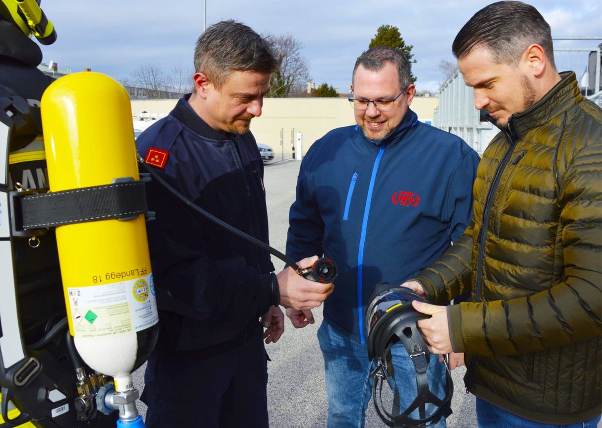 Bei der heutigen Übergabe zeigten die Kommandanten und deren Sachbearbeiter Atemschutz unserem Bürgermeister Thomas-Sabbata Valteiner und Feuerwehrreferent GGR Harald Steiner die neuen Geräte und deren Handhabung.